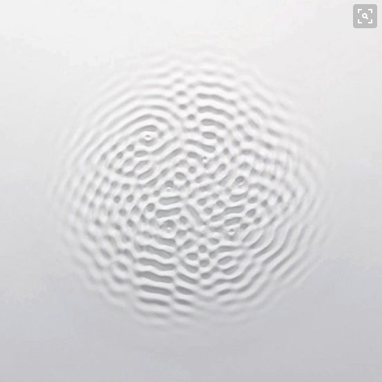 This image features a strong, concentric wave pattern emanating from a central dark void, creating a dynamic and abstract visual effect. The use of light blue tones against a deep black background suggests themes of sound, vibration, or energy.