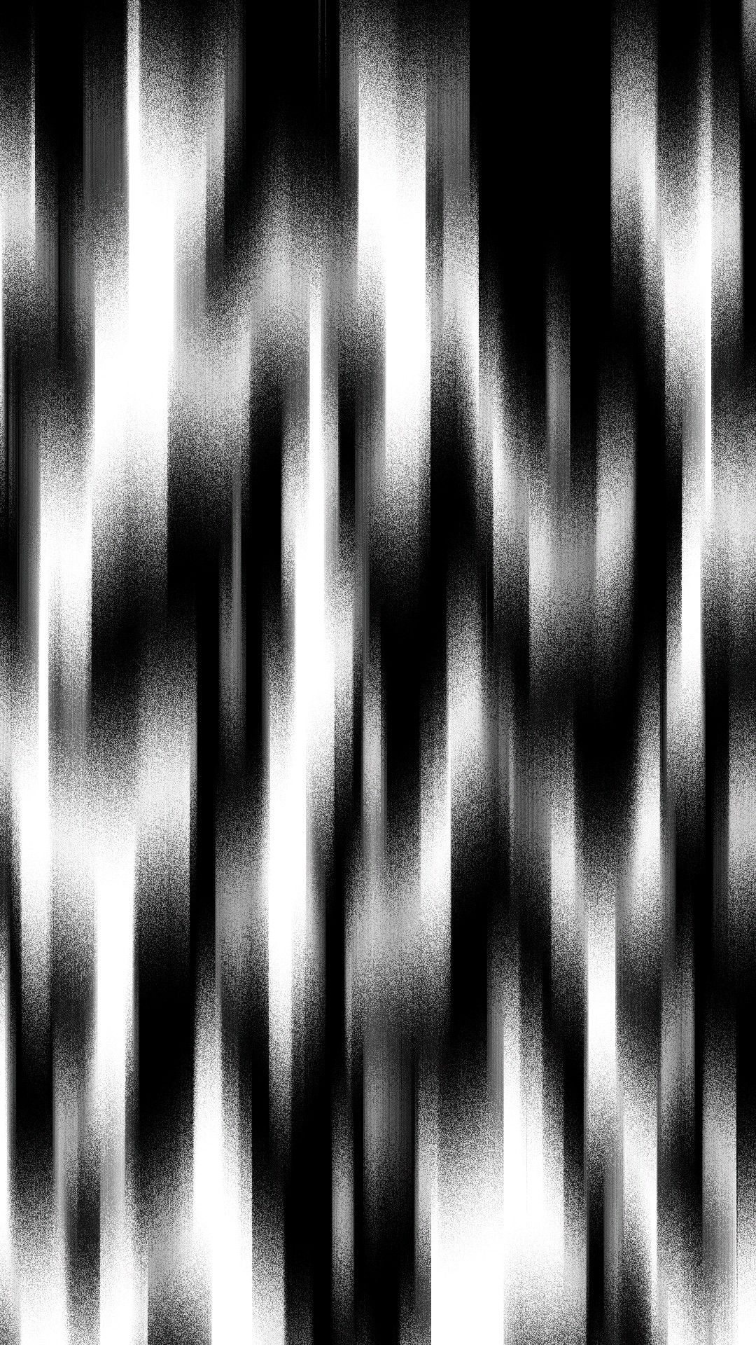 This abstract composition utilizes high contrast between pure black and brilliant white to create a dynamic, striated effect. The vertical lines suggest movement, light refraction, or digital distortion, resulting in a stark and visually arresting texture.