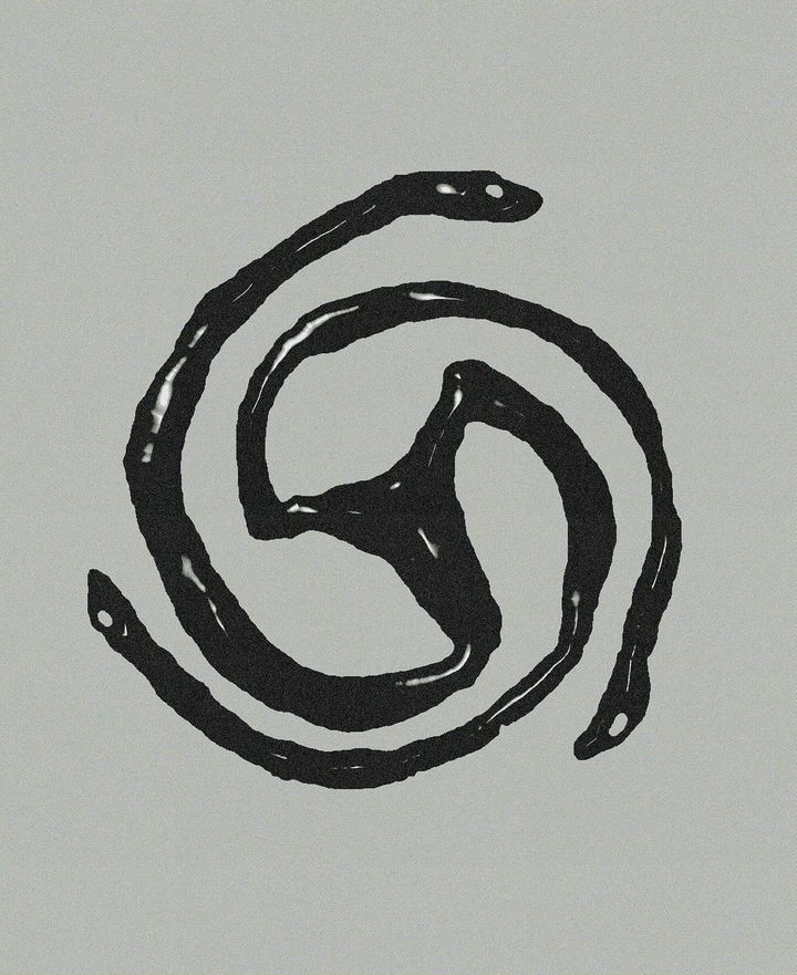 This is a dynamic, abstract line drawing characterized by thick, continuous strokes forming a swirling vortex or stylized serpentine shape. The visual language relies on fluid motion and cyclical symmetry, creating a sense of movement and organic complexity through minimalist execution.