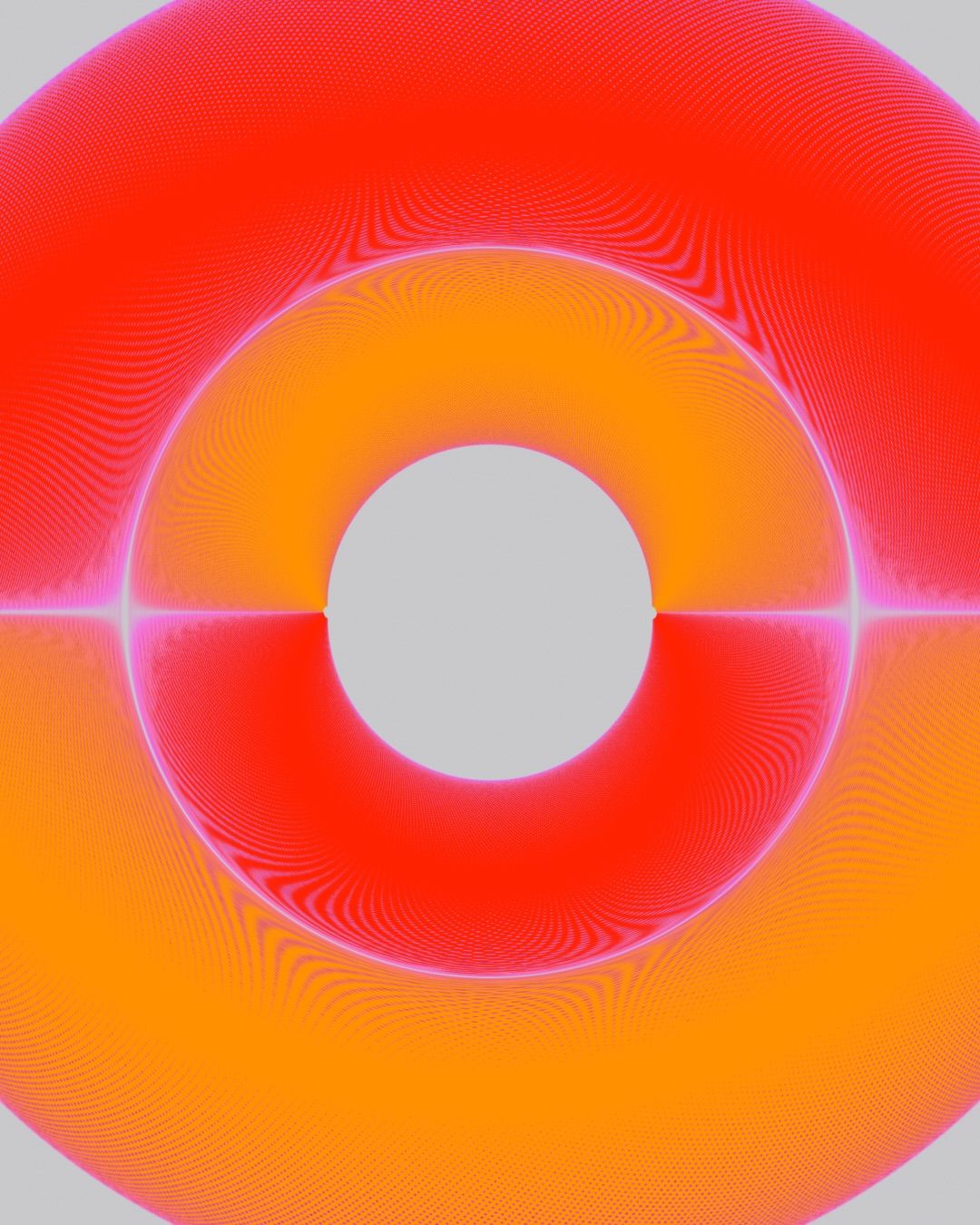 This is a highly symmetrical, abstract design utilizing smooth radial gradients to create depth and form. The visual language relies heavily on concentric circles and fine line work, resulting in an ethereal and deeply saturated impression. The composition successfully guides the viewer's eye toward the central negative space, creating a sense of focus and serene complexity.