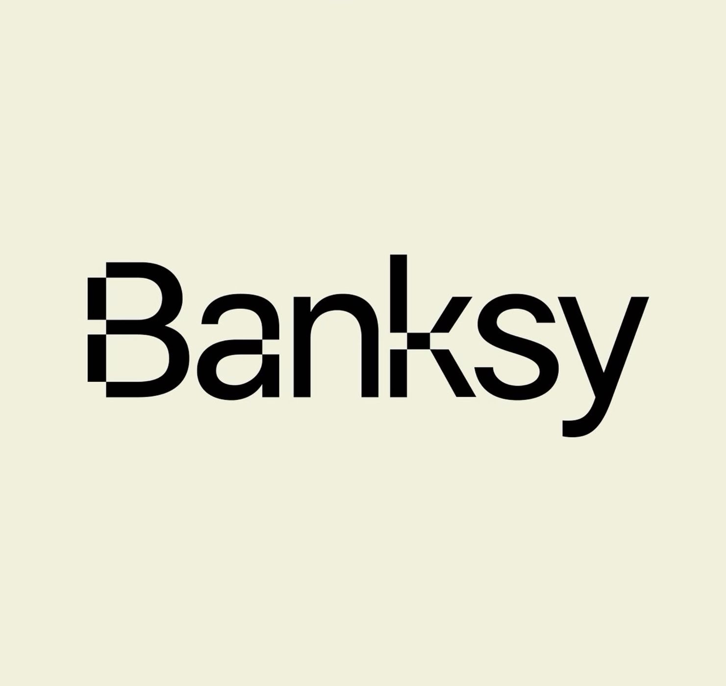 This design utilizes a stark, minimalist approach, featuring the wordmark 'Banksy' rendered in a geometric typeface. The visual language relies heavily on high contrast between black text and a muted, warm background to achieve a sophisticated and modern feel.