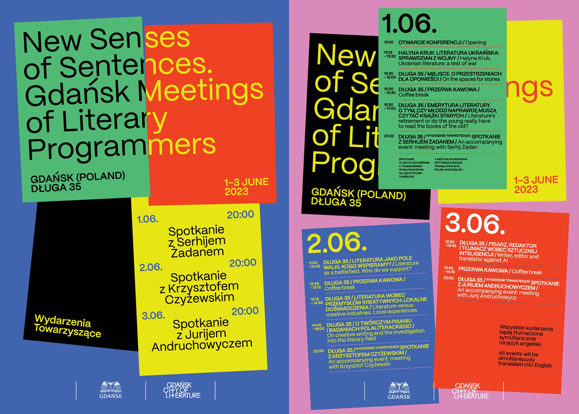 This design utilizes a bold, modular layout with high-contrast color blocking to organize complex event information clearly. The visual language is modern and graphic, effectively uses negative space, and establishes a strong hierarchy between titles and detailed schedules.