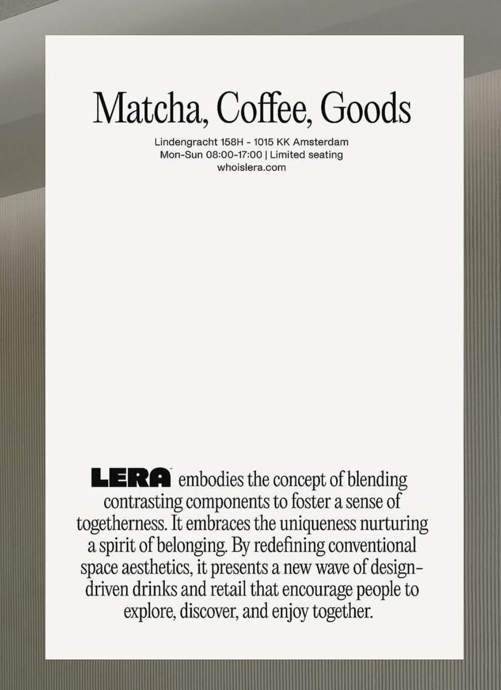 A minimalist, contemporary design featuring clean typography and ample whitespace that conveys sophistication and intentionality. The layout balances a bold headline with descriptive text and a brand philosophy statement, creating a refined, editorial aesthetic typical of modern specialty retail or hospitality branding.