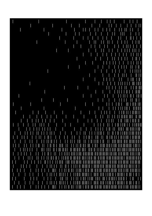 A minimalist generative art piece featuring a gradient density pattern of vertical lines transitioning from sparse to densely packed, creating a sense of depth and movement. The monochromatic black and white composition uses algorithmic distribution to build visual complexity from simplicity, evoking data visualization and digital abstraction.