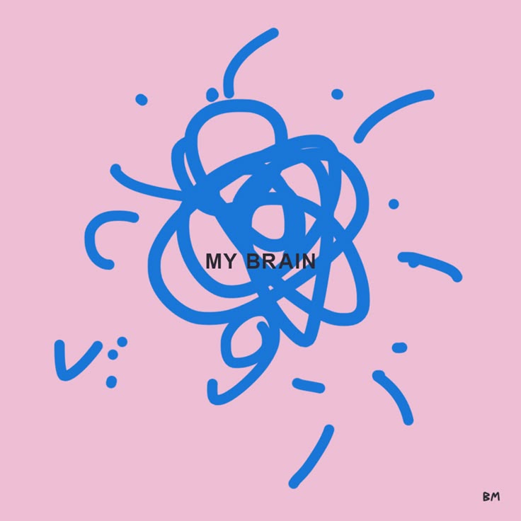 This is a hand-drawn, abstract line art illustration depicting a tangled mass of blue lines against a soft pink background. The style is organic and expressive, suggesting concepts like thought, complexity, or mental activity.