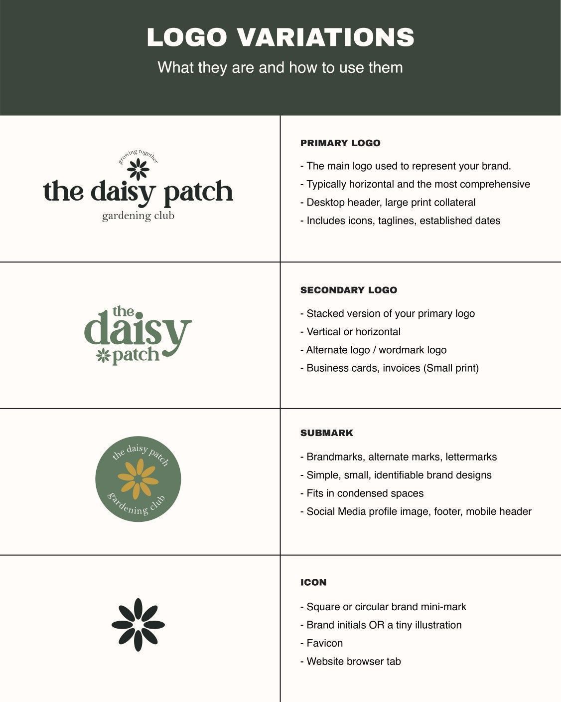 This image presents a highly structured and clean guide detailing various logo variations for a gardening club. The visual language relies on simple line art and clear hierarchy to explain the functional differences between primary logos, secondary marks, and icons. The overall feel is professional, trustworthy, and rooted in natural simplicity.