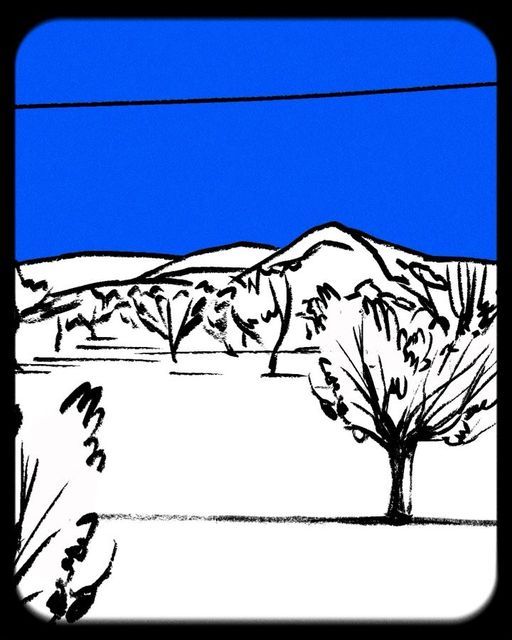 This is a minimalist graphic illustration utilizing strong contrast between solid blue sky and silhouetted landforms. The visual language relies on simple line work and flat color blocking to convey a serene, natural landscape. The overall feel is clean, stark, and evocative of open space.