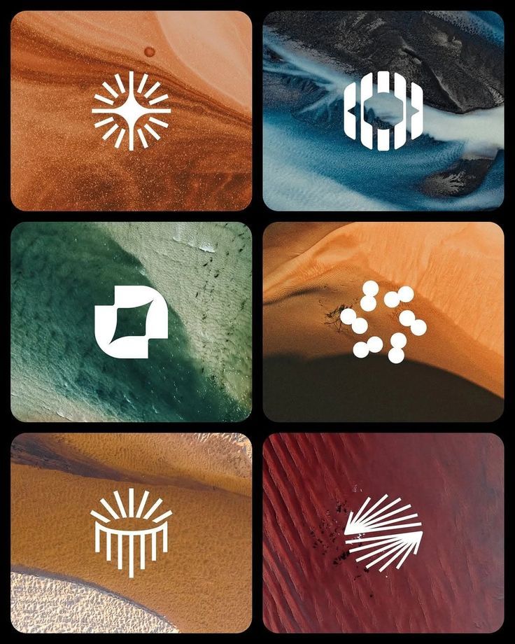 This image presents a cohesive grid of five abstract design concepts, utilizing high contrast between stark white symbols and richly textured, earthy backgrounds. The visual language balances organic textures like sand and foliage with clean geometric forms, resulting in a modern and sophisticated aesthetic.