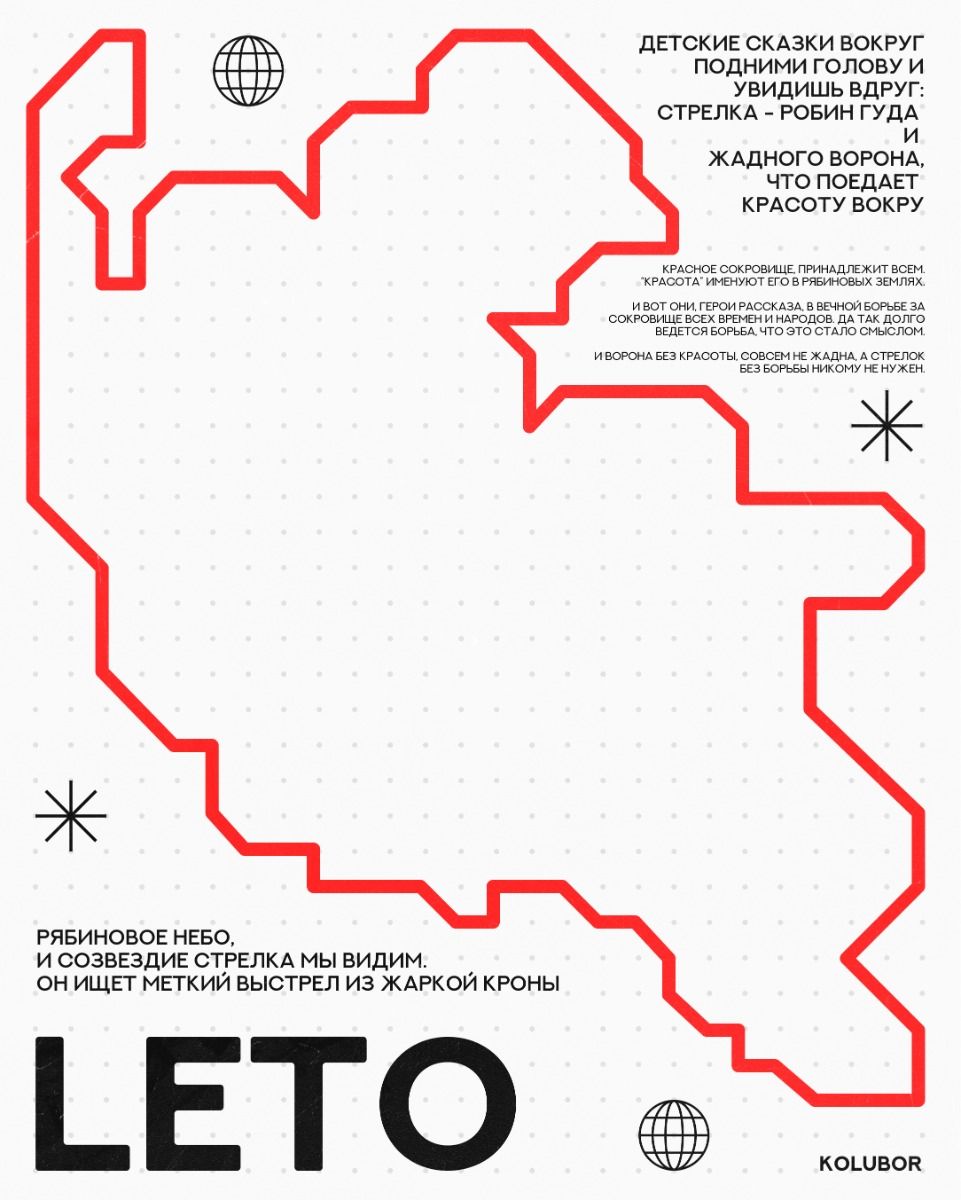 This design utilizes a strong, graphic line art style to depict an organic shape, likely representing a region or natural form. The visual language is clean and illustrative, effectively combining abstract shapes with textual information to convey a seasonal or folkloric theme. The composition is balanced, using negative space to highlight the central red outline.