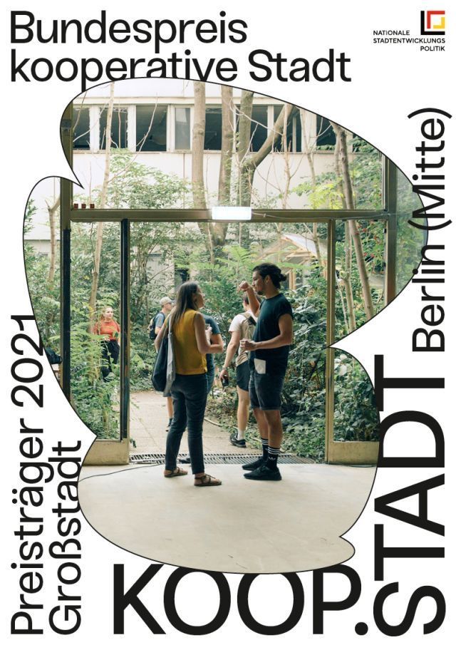 A contemporary design poster for an urban cooperative award program, featuring a striking organic cutout shape that frames a photograph of people in a greenhouse. The layout combines bold typography with a nature-focused image, creating a modern yet approachable aesthetic that emphasizes community and sustainability.
