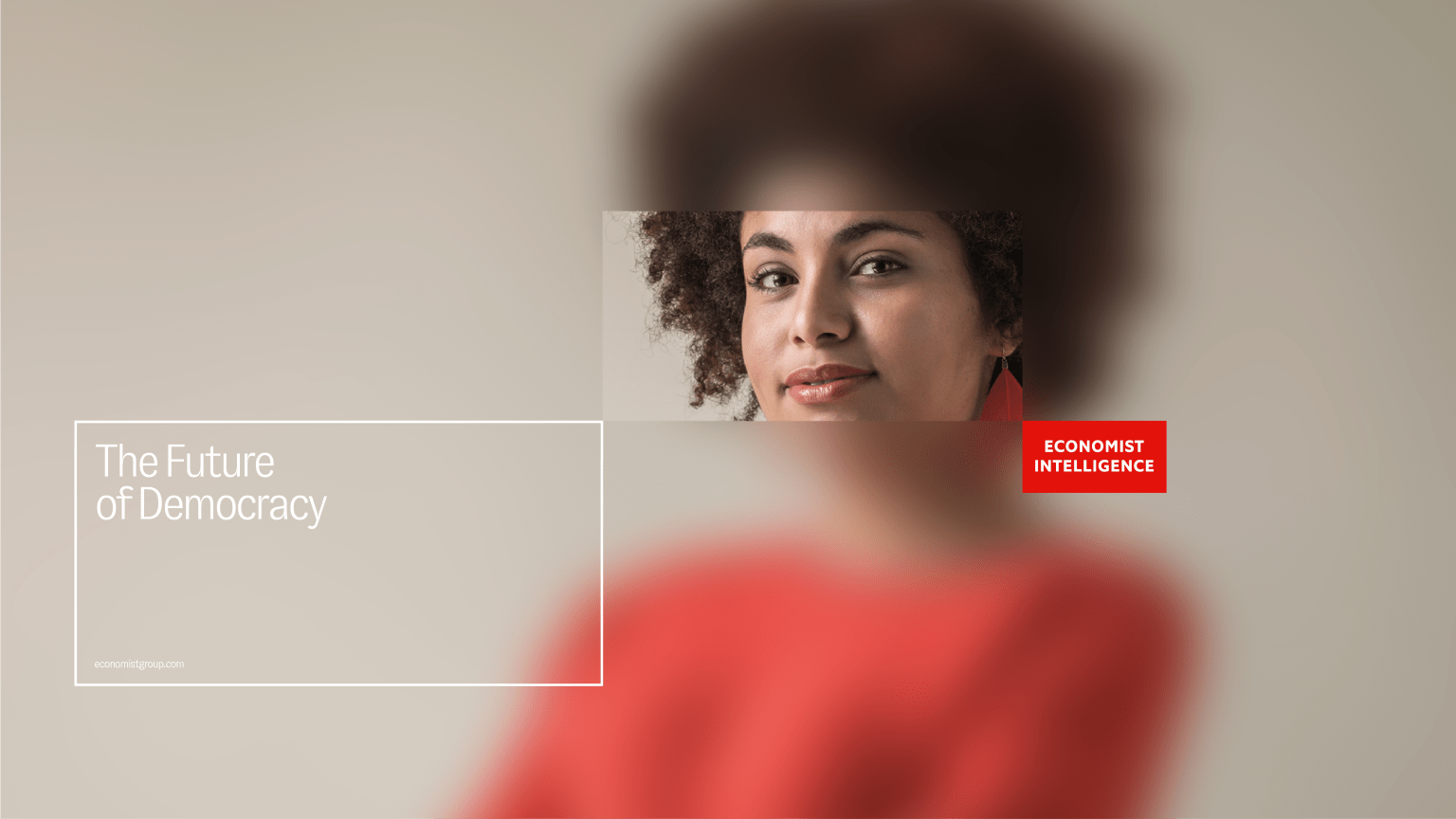 A contemporary editorial design featuring a portrait of a person with curly hair wearing red, set against a minimalist beige background. The layout combines clean typography with a bold red accent element, creating a modern and sophisticated visual hierarchy that suggests political or social commentary.