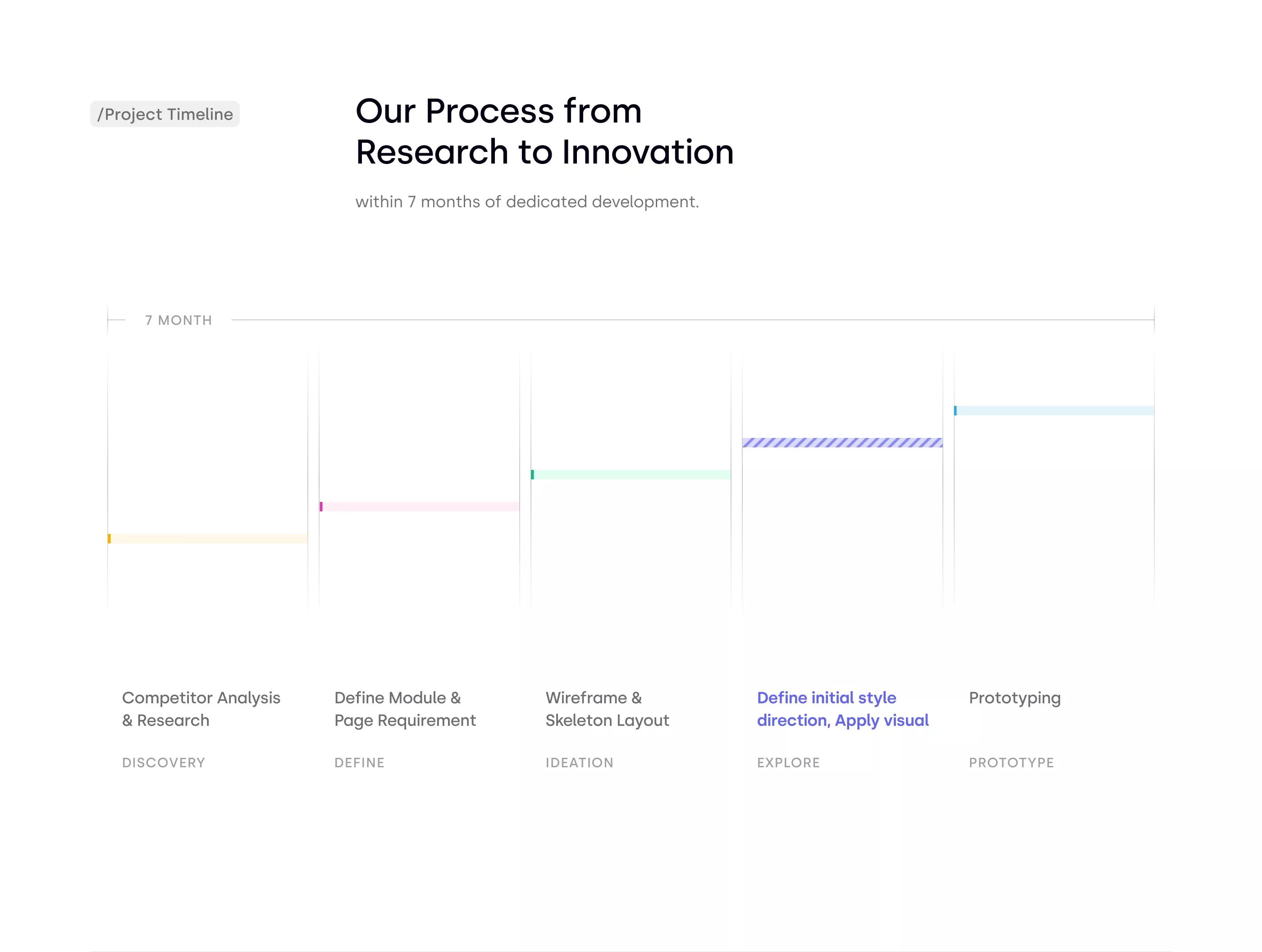 This is a clean, professional infographic illustrating a linear project development process. The design uses subtle color coding and clear text labels to guide the viewer through sequential stages, emphasizing structure and methodical progression.