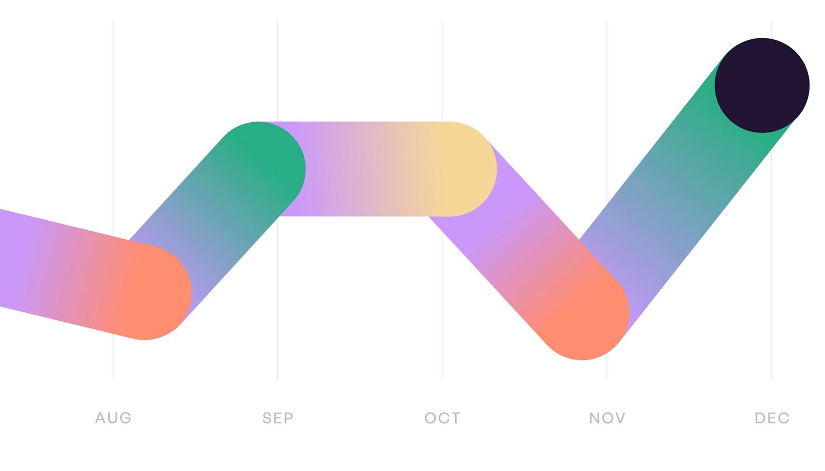 This is a minimalist, timeline-style data visualization using a smooth, flowing ribbon or wave graphic to represent progression over months. The design relies on soft gradients and muted pastel tones, creating a gentle and modern aesthetic.