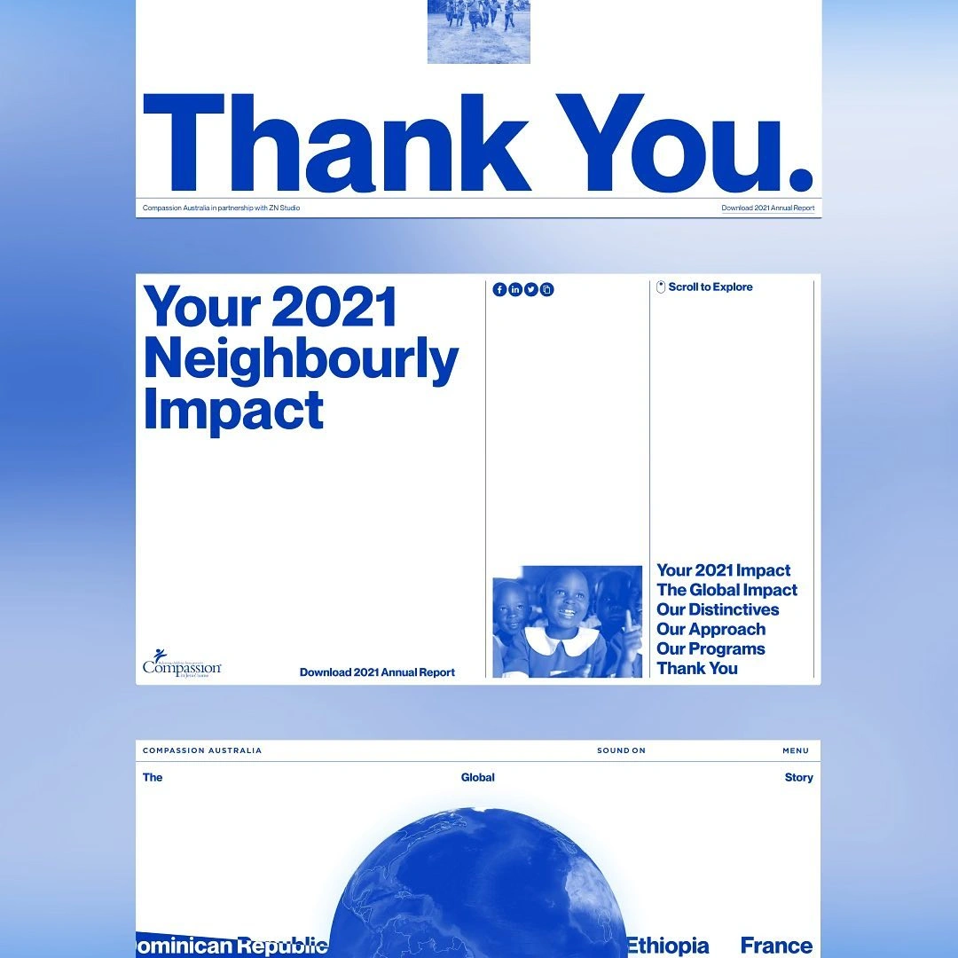 This design employs a clean, corporate aesthetic utilizing a cool blue palette and ample whitespace to convey professionalism and gratitude. The layout is balanced, centering the main message while integrating subtle photographic elements to anchor the impact story.
