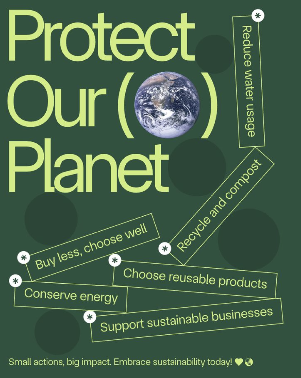 A bold environmental advocacy poster featuring a striking lime-green typography treatment against a deep forest green background. The design integrates Earth imagery with a hierarchical system of sustainability action items, creating an urgent yet hopeful call-to-action for ecological responsibility.