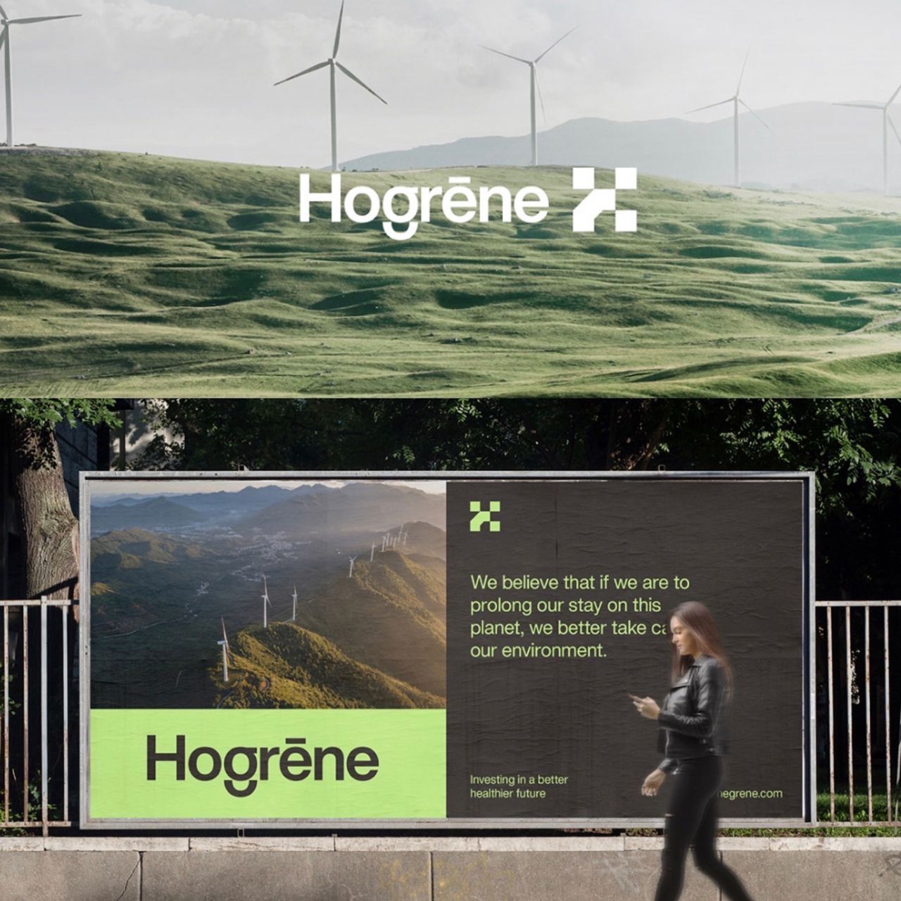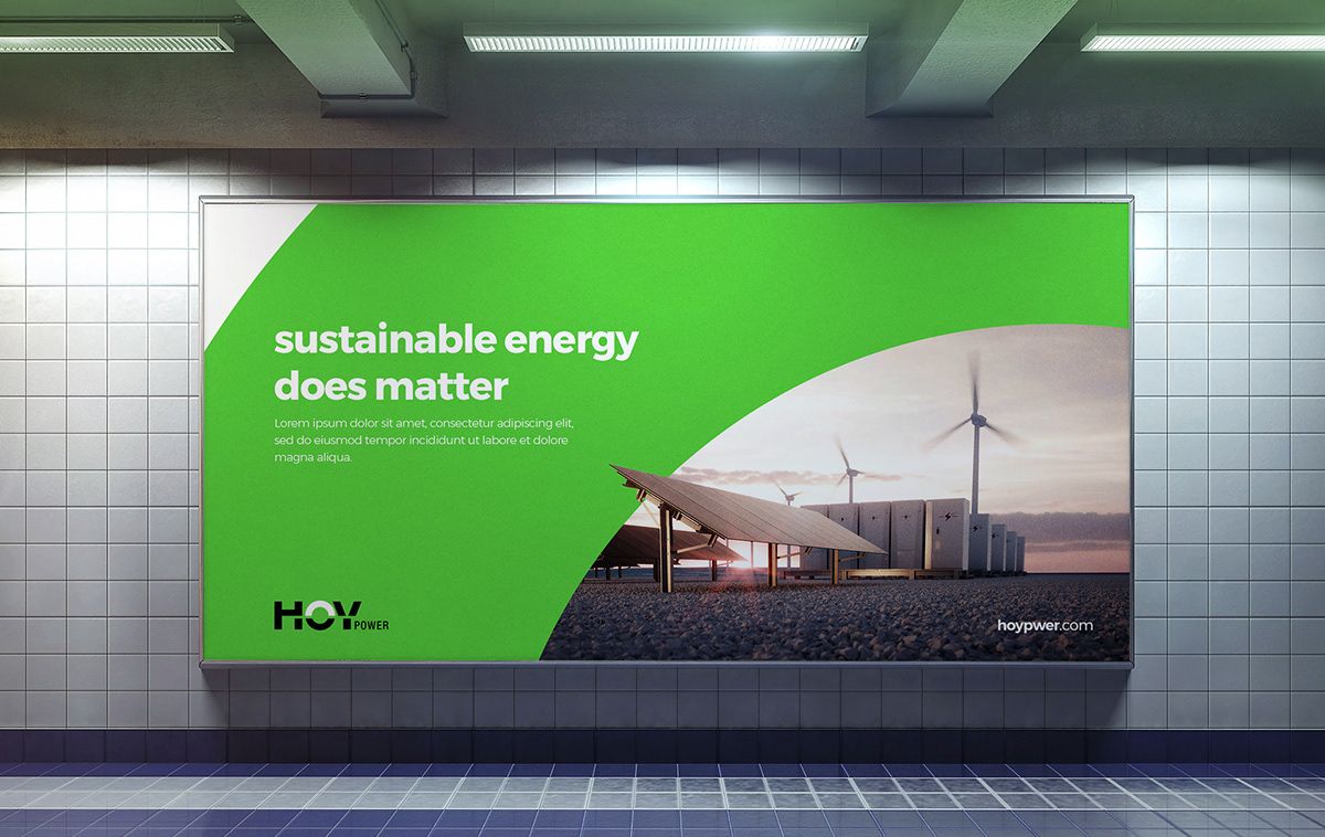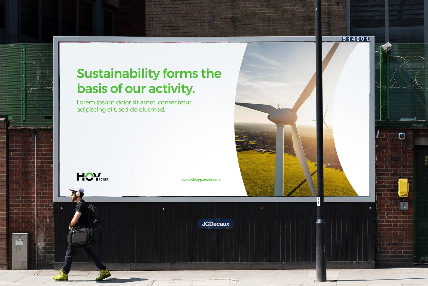 This design effectively merges corporate messaging about sustainability with aspirational natural imagery, creating a clean and responsible visual statement. The layout is balanced, using negative space to draw attention to the powerful juxtaposition between the text and the large scale of the wind turbine.