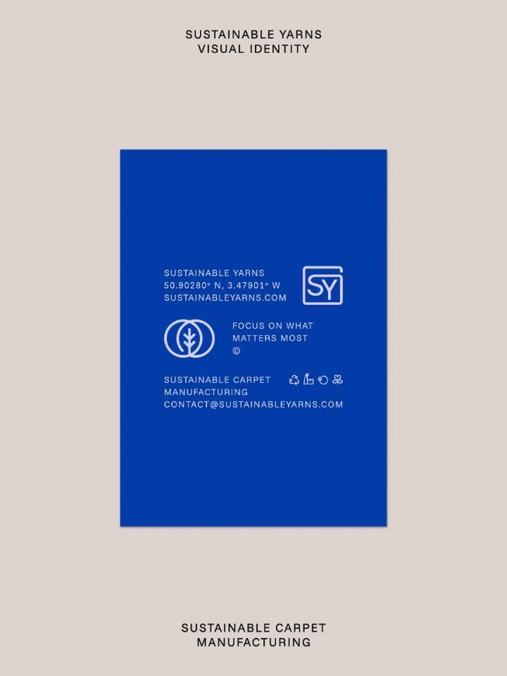 A minimalist brand identity system for Sustainable Yarns featuring a bold cobalt blue card against a neutral beige background. The design employs clean typography, geometric iconography, and a restrained color palette to communicate environmental responsibility and modern professionalism.