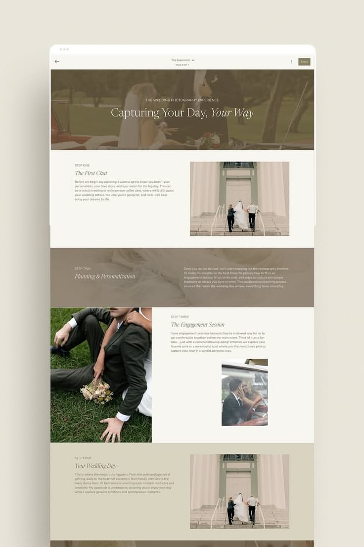This design utilizes a clean, minimalist aesthetic to showcase wedding photography services. The visual language is elegant and organic, relying heavily on high-quality imagery and generous negative space to create a sense of luxury and intimacy.