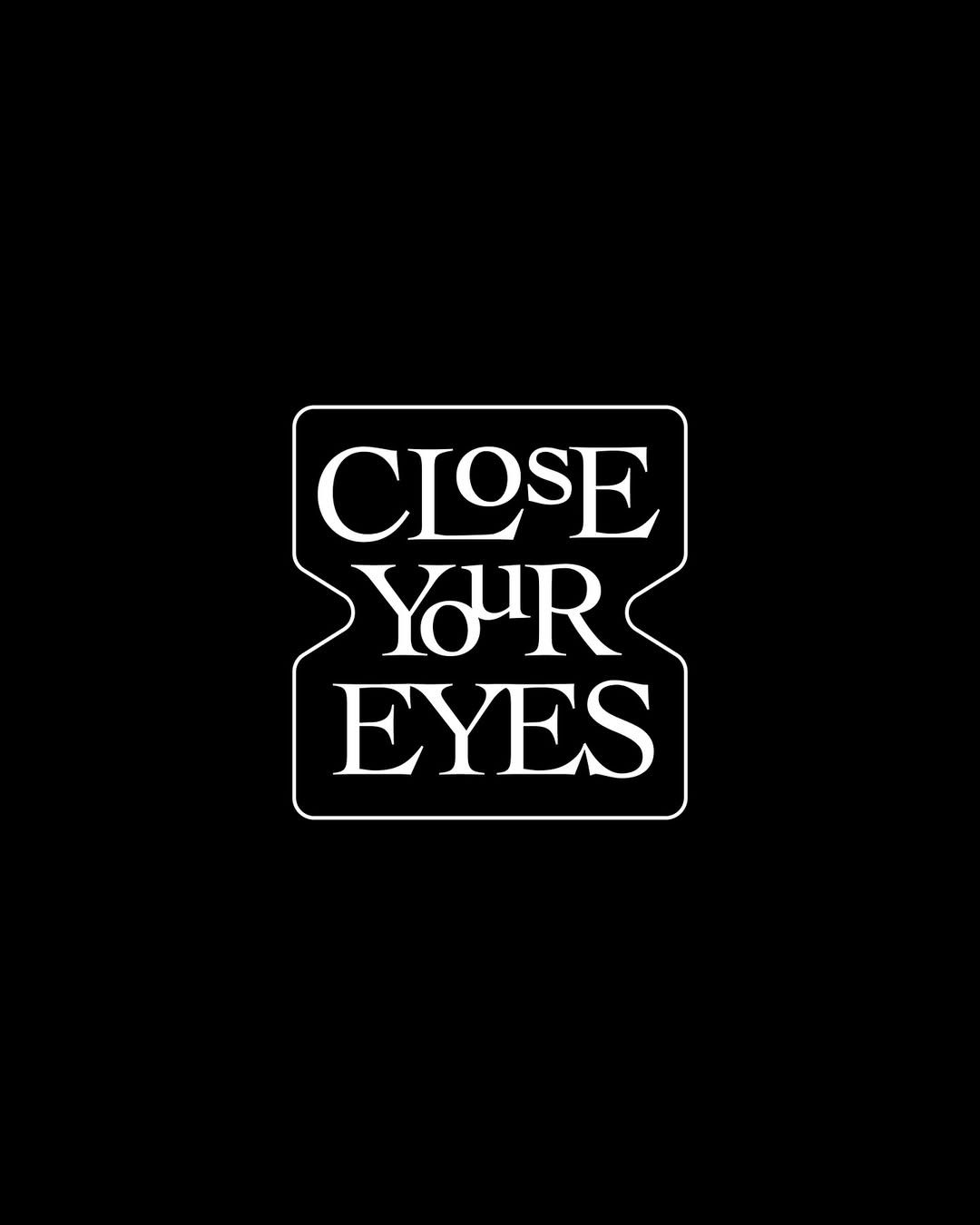 This is a stark, minimalist graphic featuring the text 'CLOSE YOUR EYES' enclosed within a custom, blocky border. The design relies heavily on negative space and high contrast to convey a direct, perhaps intense or secretive message.