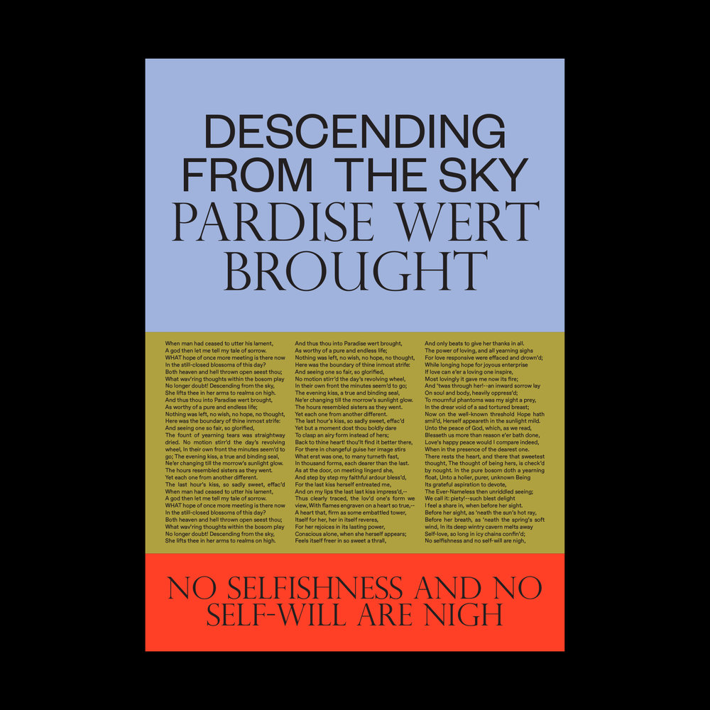 This is a stark, text-heavy graphic design piece characterized by high contrast and a minimalist layout. The design uses large blocks of text to convey a profound, perhaps spiritual or philosophical message with a serious and weighty tone.