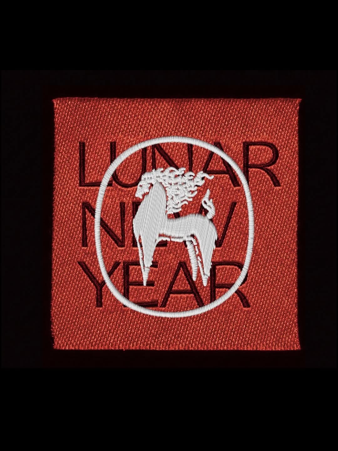 This image features a textile design with a distressed, woven texture in a warm orange hue. The central graphic is a silhouette of a horse's head within a circular border, surrounded by text that reads 'LUNAR NEW YEAR'. The overall aesthetic is rustic and commemorative.