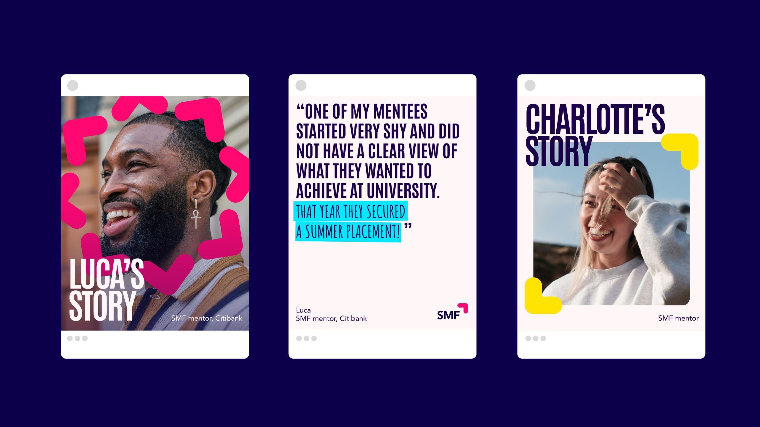 This image displays a set of three cohesive, modern testimonial cards designed for storytelling or mentorship features. The design uses clean layouts, high-quality photography, and strategic use of color blocking to create an engaging and professional feel.