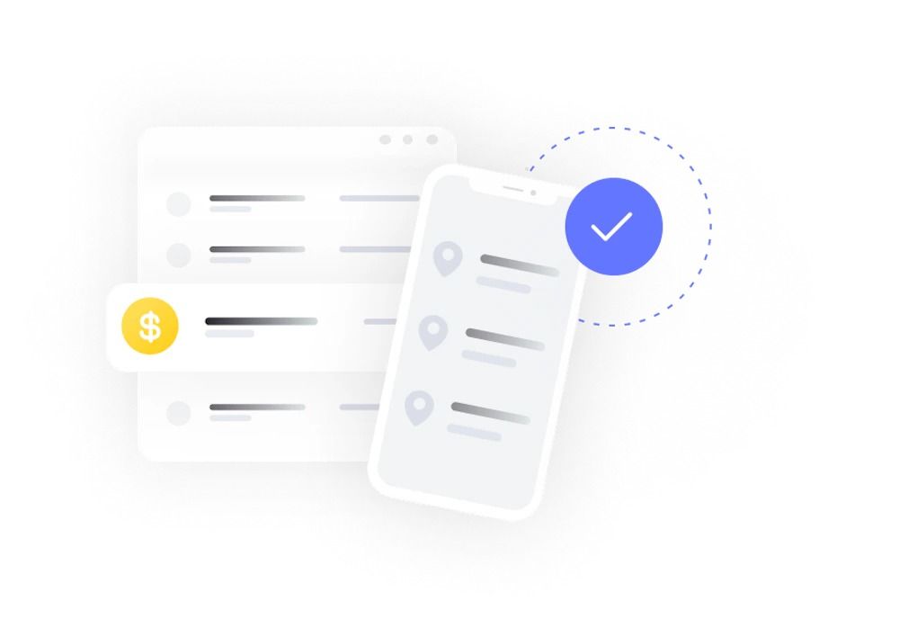 The image presents a clean, modern user interface (UI) mockup featuring elements related to financial transactions or listings. The design relies heavily on white space and subtle gray lines, conveying a sense of professionalism and successful completion.