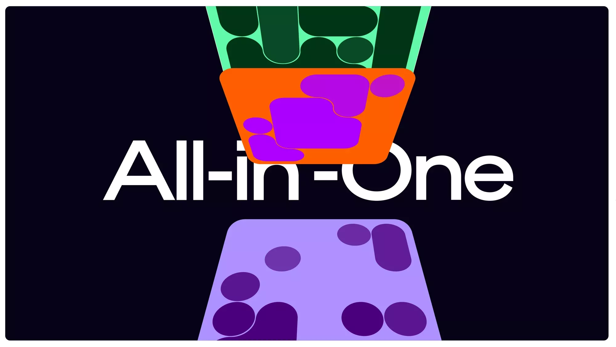 A bold, modern digital illustration featuring a stylized funnel or container system with vibrant neon colors against a dark background. The design uses geometric shapes and organic blob forms to create a dynamic, contemporary visual that communicates the concept of consolidation or integration through the 'All-in-One' messaging.