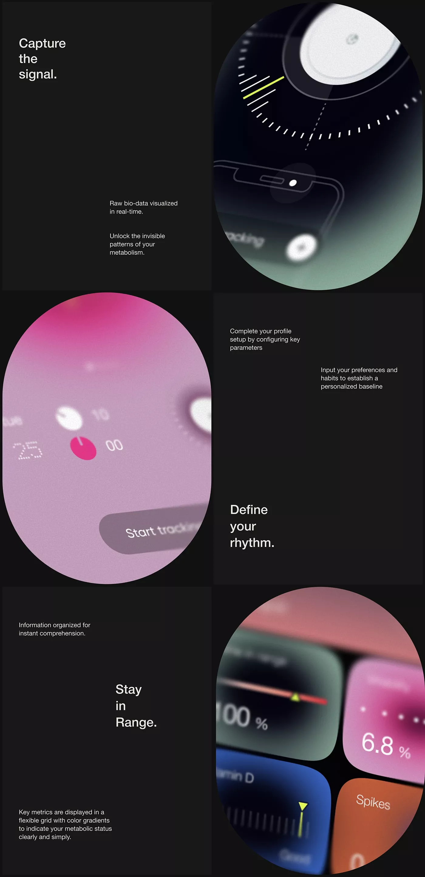 A modern, tech-forward design layout featuring abstract circular UI elements with gradient overlays in pink, teal, and warm tones. The composition blends digital interface mockups with organic, spherical shapes against a dark background, creating a contemporary aesthetic that feels both futuristic and approachable.