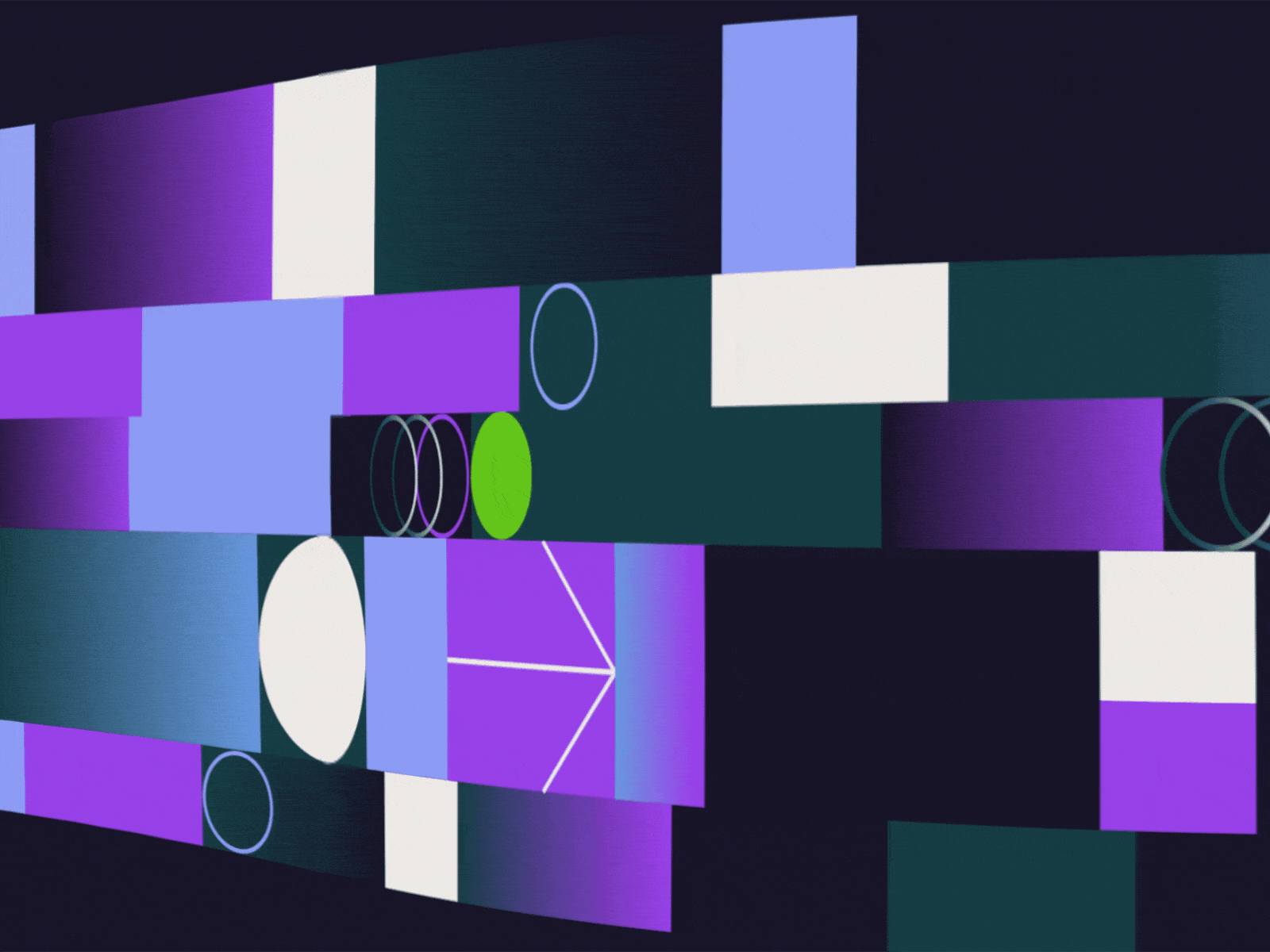 A dynamic, abstract composition featuring bold geometric shapes and vibrant neon colors arranged in an overlapping, isometric-like layout. The design combines sharp rectangular blocks with circular elements and linear accents, creating a sense of depth and movement against a dark background. The visual language is contemporary and tech-forward, with a strong emphasis on color contrast and spatial layering.