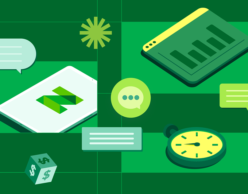 The image features a flat, modern design utilizing a vibrant green and muted teal color palette against a grid background. It employs simple, recognizable icons and data visualizations to convey concepts related to technology, finance, or analytics in a clean, organized manner.