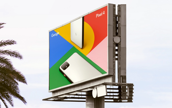 This image depicts a large, modern outdoor digital billboard showcasing Google Pixel 4 devices. The design is clean, utilizing bold geometric shapes and the recognizable Google color palette to create a vibrant yet organized visual statement.