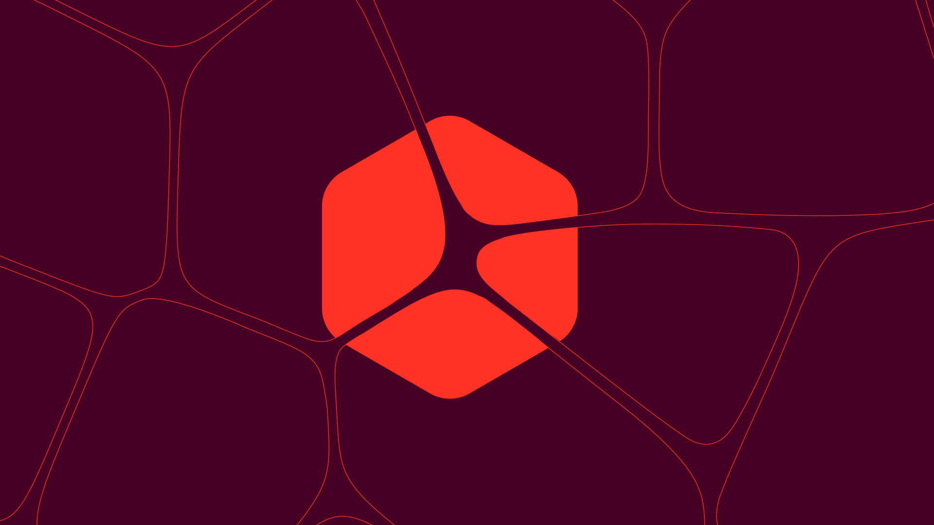 The image features a deep, rich maroon background overlaid with subtle, interconnected lines forming a hexagonal grid structure. A central, vibrant orange-red geometric shape provides a focal point against the dark backdrop.
