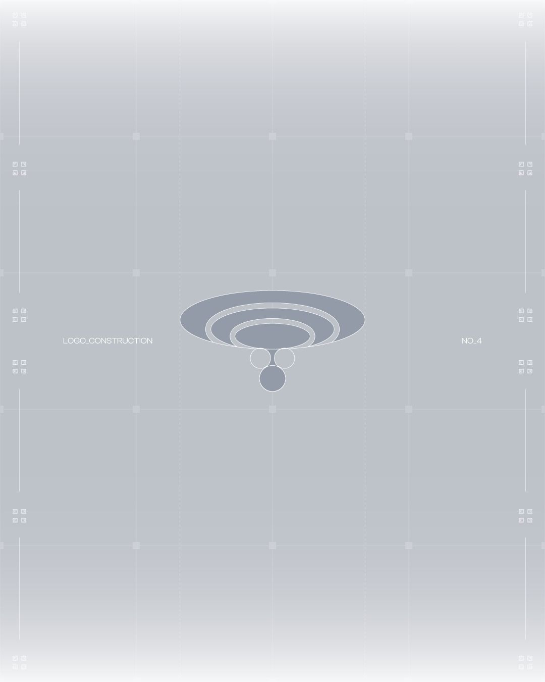 The design is minimalist and modern, utilizing a stark black background to emphasize a clean, geometric logo. The visual language is precise and technical, relying on negative space and a simple pattern to convey a digital or cosmic theme.