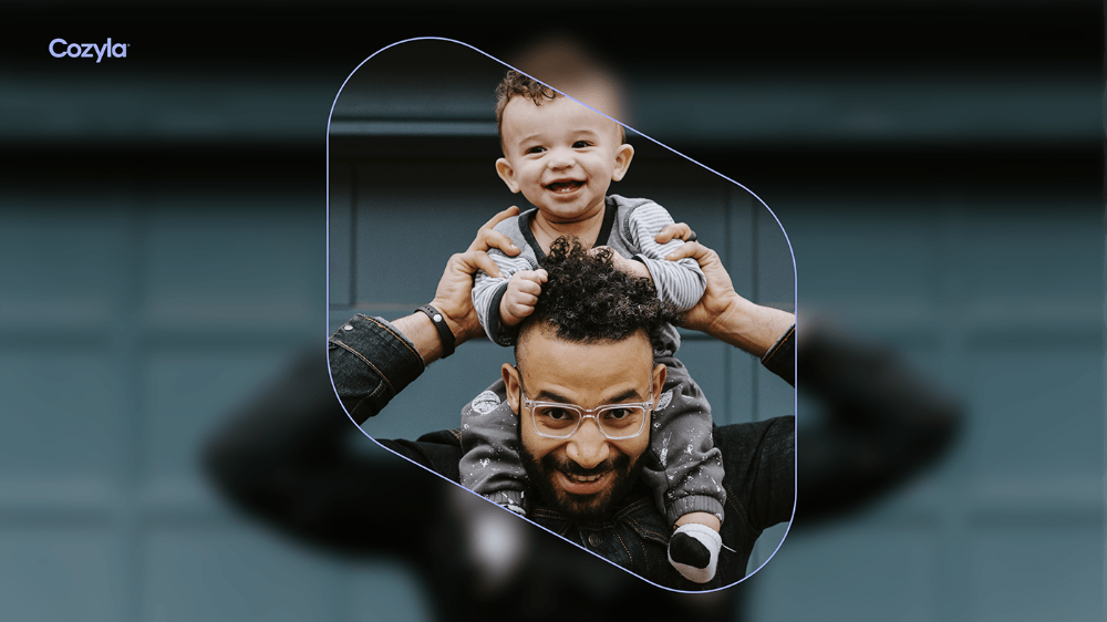 A modern, minimalist design featuring a candid family moment with a father and child framed within a soft, rounded geometric border. The composition uses a clean aesthetic with subtle depth-of-field effects and a contemporary color grading that emphasizes warmth and intimacy against a cool, muted background.