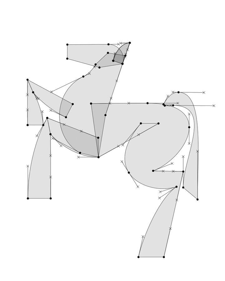 This image presents a complex, abstract line drawing or wireframe structure composed of interconnected polygonal shapes. The visual language relies on thin lines and overlapping forms to suggest movement, tension, and a sense of fragmented anatomy or organic flow.