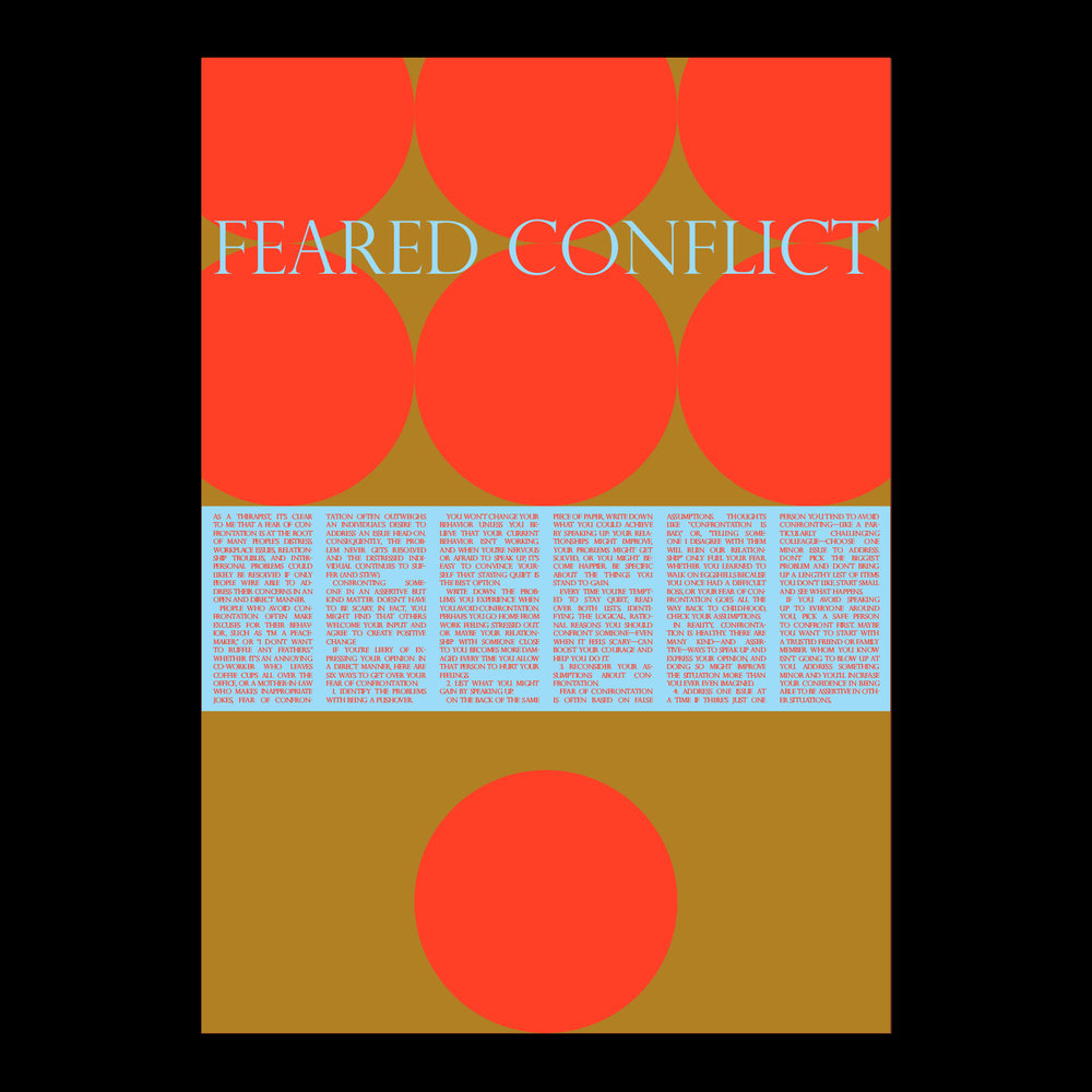 The design uses a bold, minimalist approach with large, overlapping circles in warm, earthy tones contrasted by bright orange text. The composition is strong and graphic, relying on shape and color blocking to convey a sense of tension or conflict.