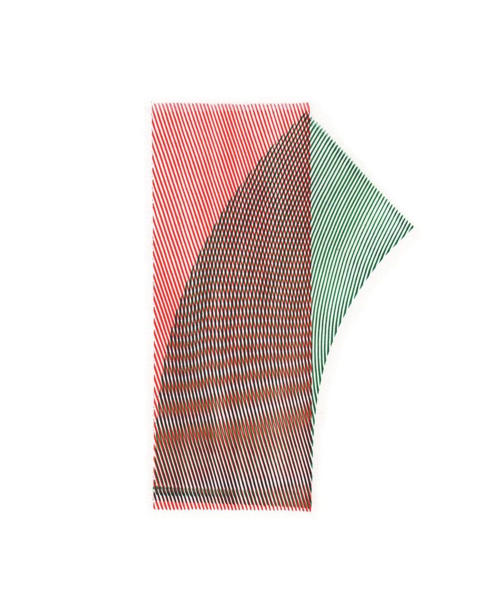 This abstract composition features a dynamic diagonal interplay between red and green stripes, creating a sense of movement and tension. The design relies heavily on texture created by parallel lines converging towards a central point, resulting in a modern and graphic feel.