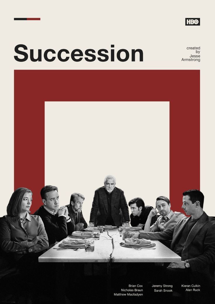 A minimalist television poster for HBO's 'Succession' featuring a boardroom scene with seven figures seated at a table against a stark geometric background. The design employs bold color blocking and negative space to convey corporate tension and power dynamics, with a refined modernist aesthetic that reflects the show's themes of wealth and family conflict.