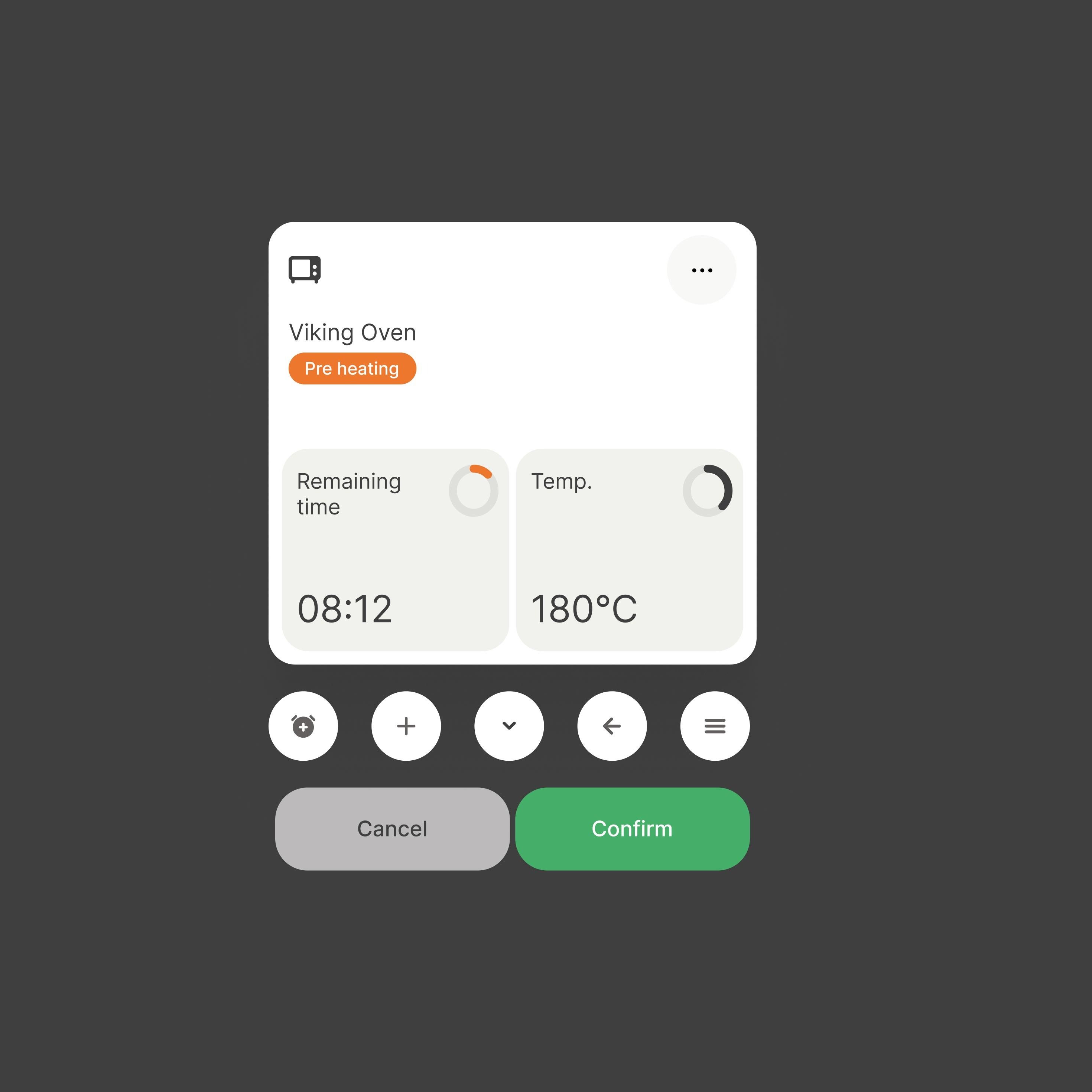 A modern smart appliance control interface displaying a Viking Oven's preheating status with real-time metrics. The design employs a clean, minimalist aesthetic with a card-based layout featuring circular progress indicators and intuitive control buttons.