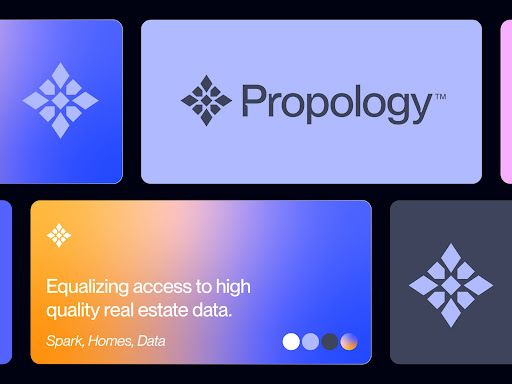 A modern SaaS product interface showcasing the Propology brand with a cohesive design system featuring gradient backgrounds and geometric iconography. The layout demonstrates a clean, professional aesthetic with rounded card components and a sophisticated color palette transitioning between warm and cool tones.
