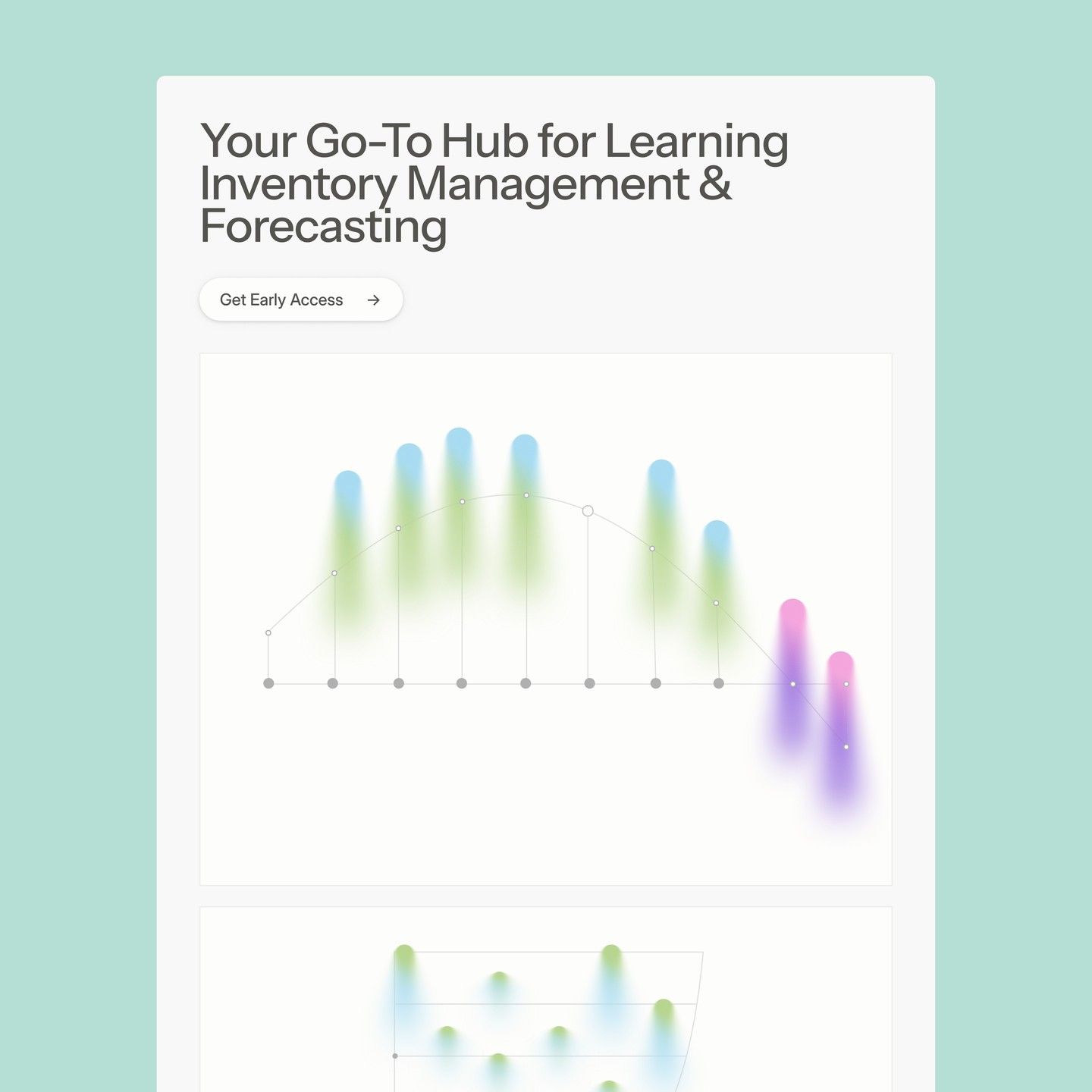 A modern SaaS landing page featuring soft, gradient data visualizations that communicate inventory and forecasting analytics. The design employs a clean, minimalist aesthetic with a calming color palette and abstract chart representations that prioritize visual clarity over technical precision.