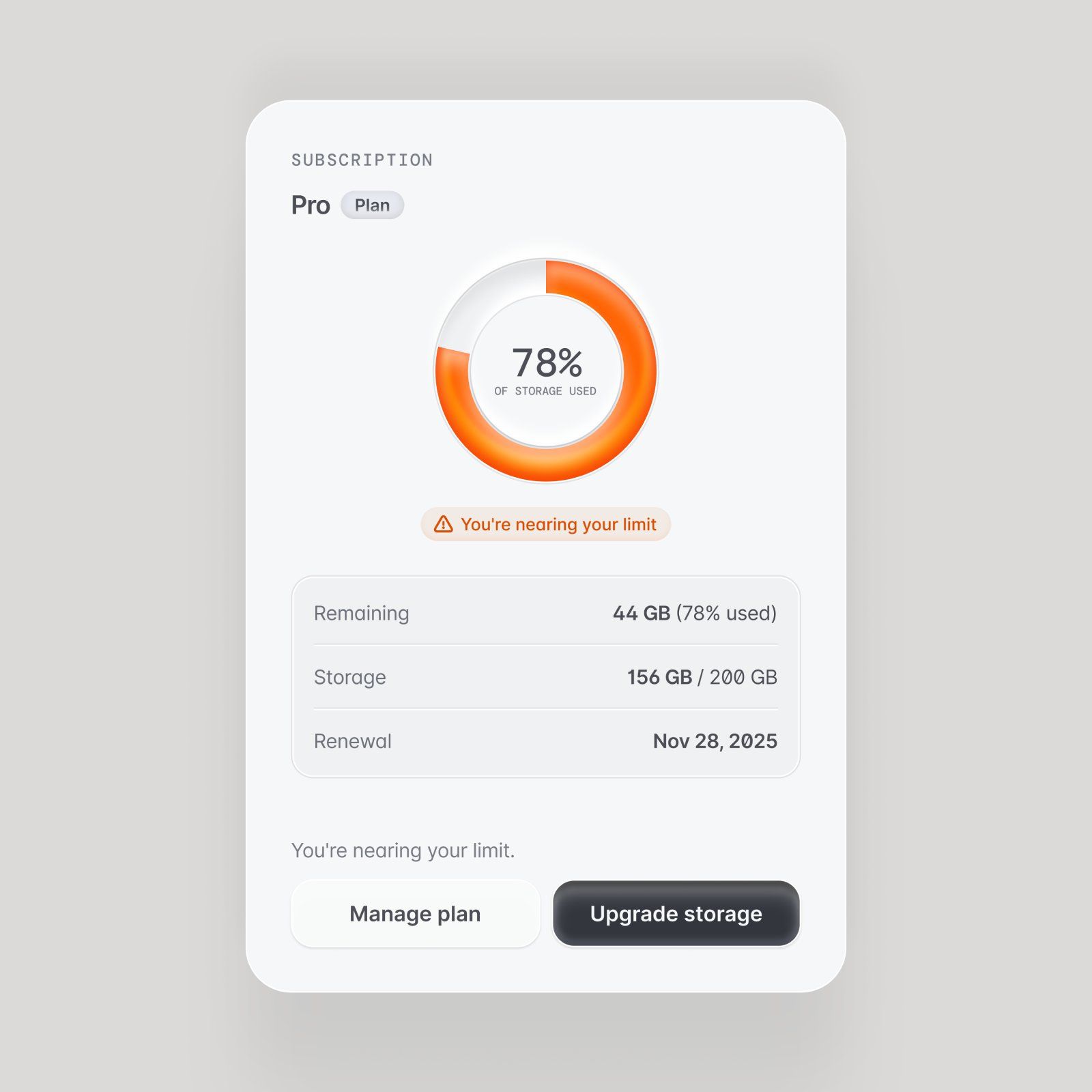 A clean, modern subscription management interface displaying storage usage with a prominent circular progress indicator. The design uses a minimalist approach with clear hierarchy, combining data visualization with actionable call-to-action buttons for plan management.