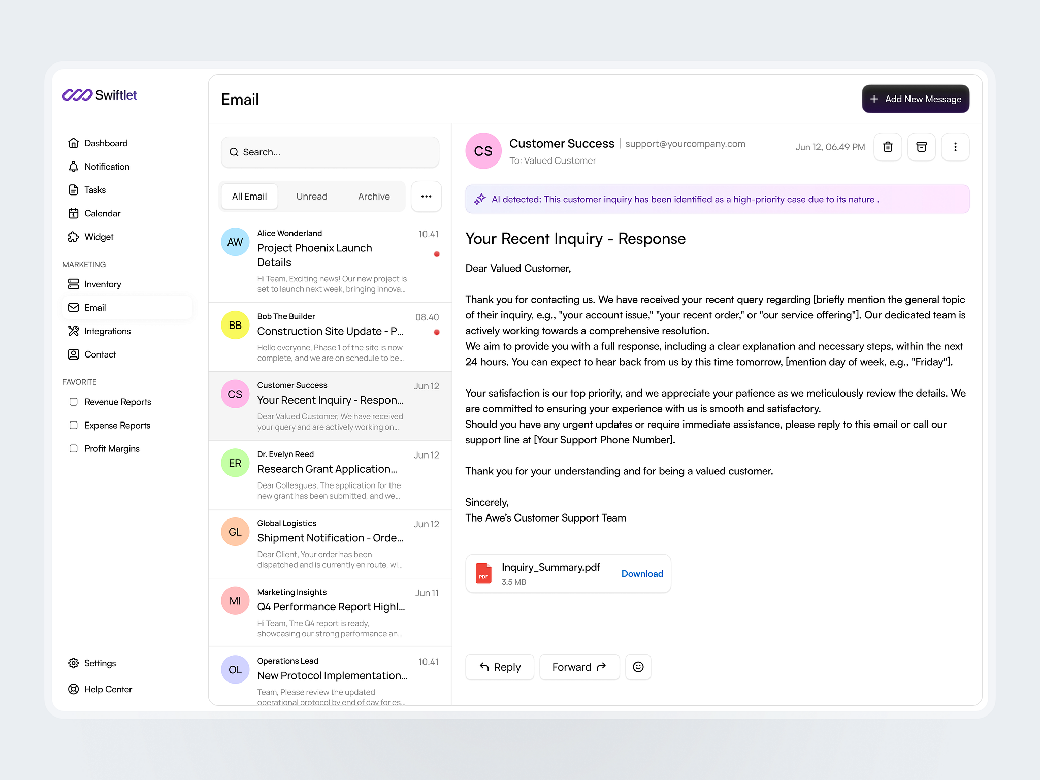 A clean, modern email client interface with a minimalist design featuring a left sidebar navigation and a central content area displaying customer support emails. The design uses a light color palette with subtle accent colors for visual hierarchy and organization.