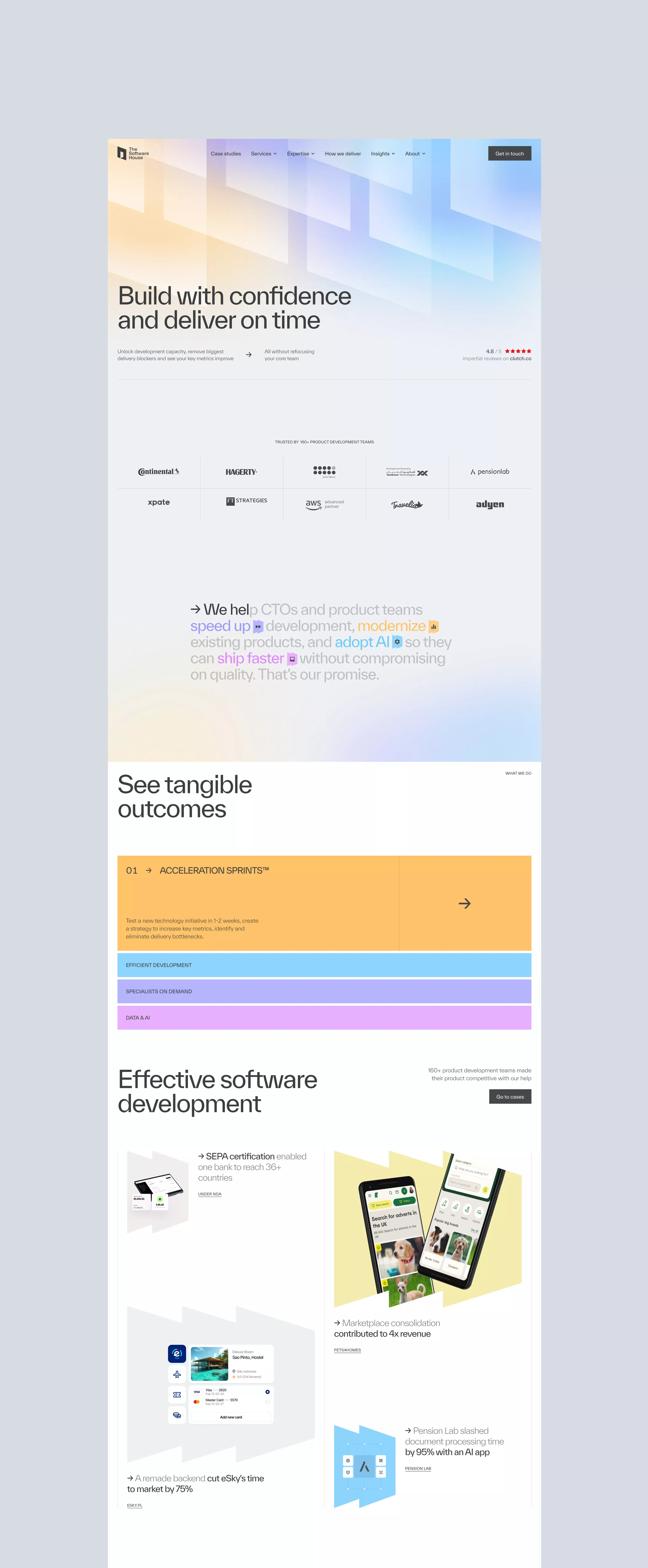 A modern SaaS landing page featuring a clean, minimalist design with a soft gradient color scheme transitioning from warm peachy tones to cool blues. The layout uses generous whitespace, organized sections with clear hierarchy, and incorporates both abstract geometric elements and product imagery to communicate software development and collaboration themes.