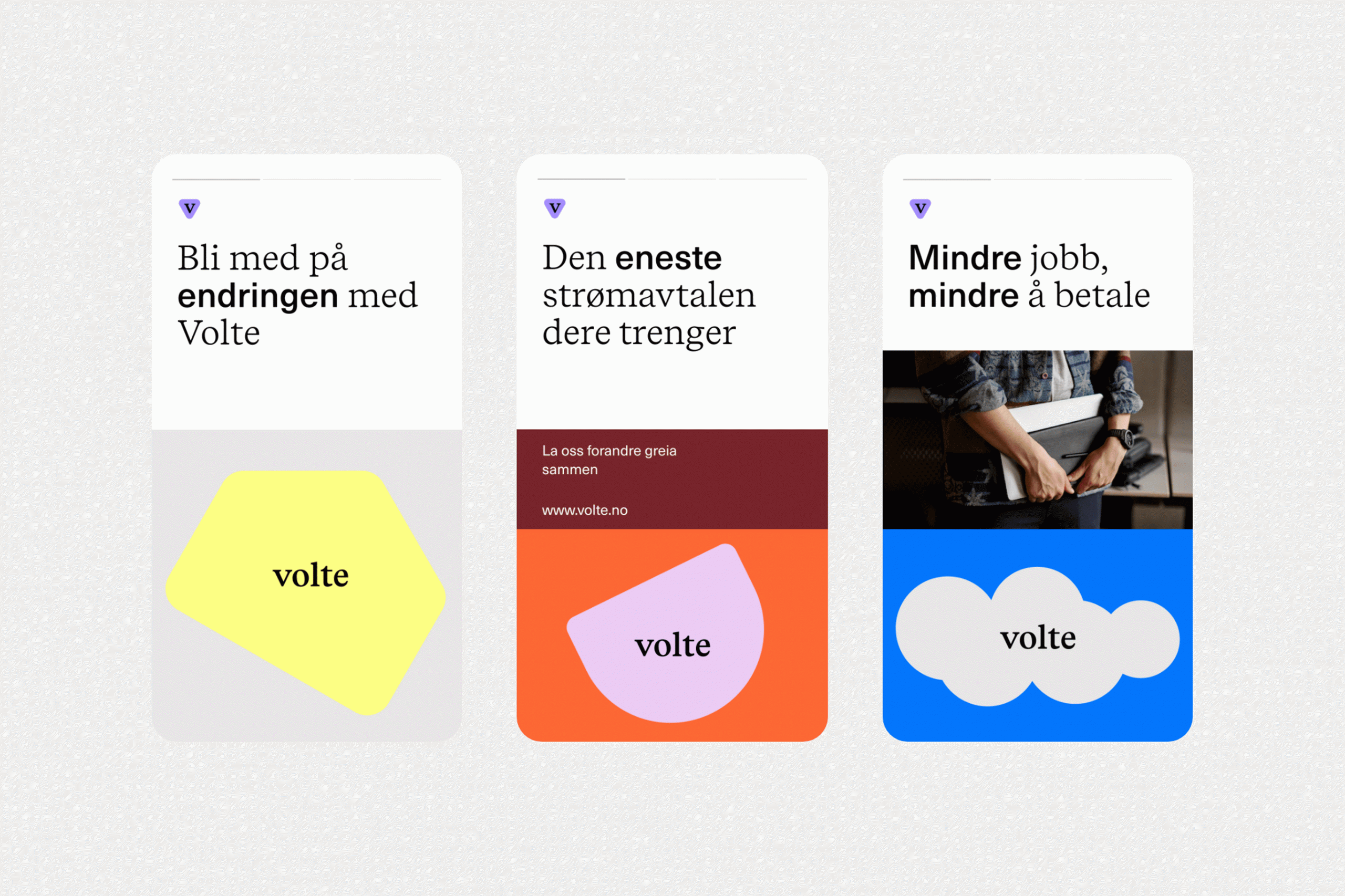 This design utilizes a clean, card-based layout with strong color blocking to present three distinct concepts. The visual language is modern and relies on a mix of abstract shapes, simple photography, and clear typography to communicate service benefits effectively.