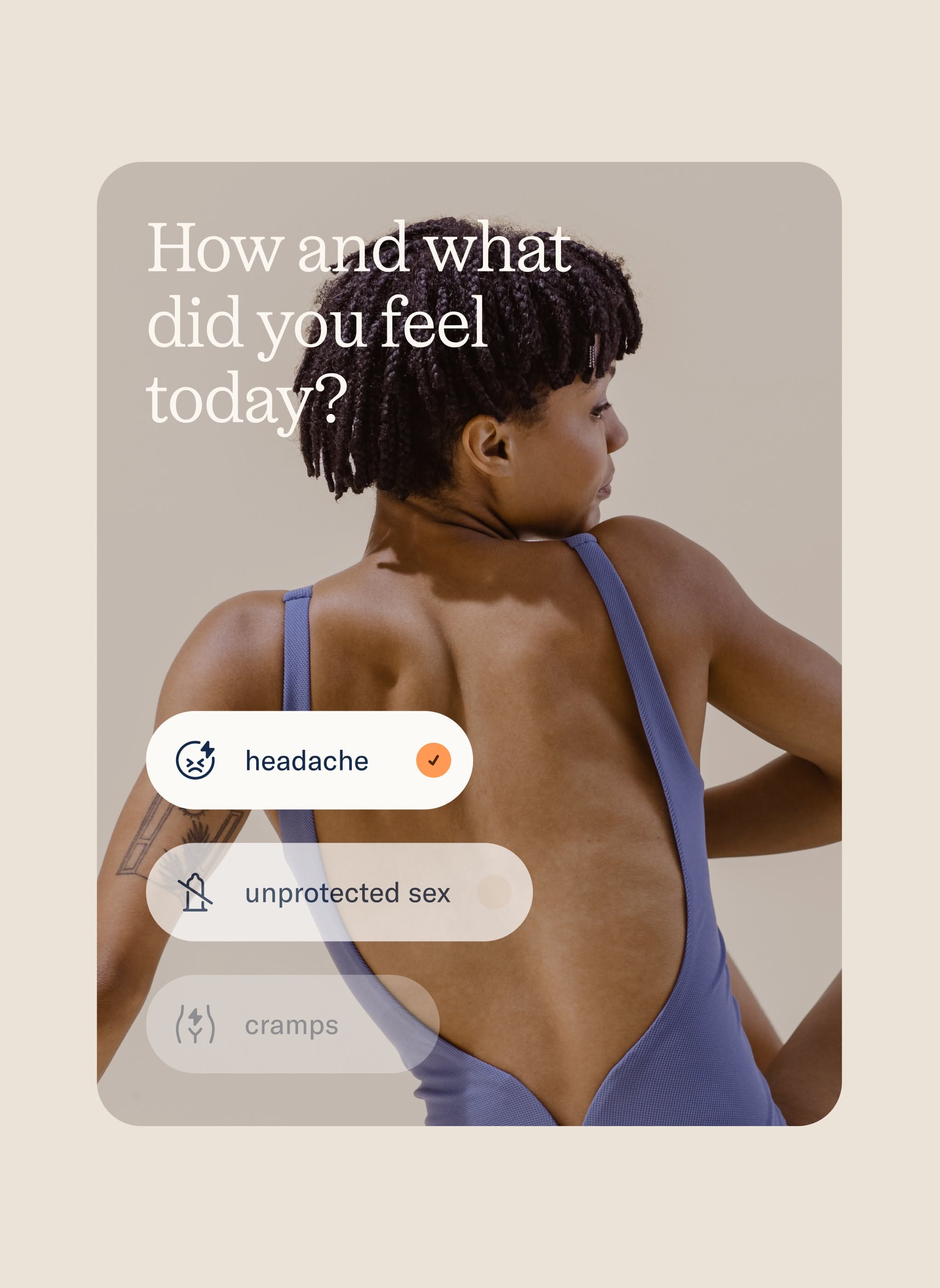 A contemporary health and wellness interface featuring a portrait-oriented mobile design with a minimalist aesthetic. The layout combines a candid photograph of a person with an interactive symptom-tracking overlay, using soft neutral tones and clean typography to create an approachable, non-judgmental digital health experience.