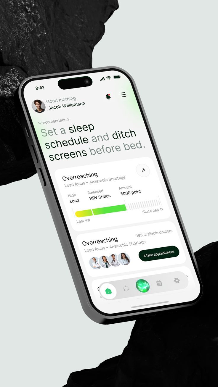 A minimalist health and wellness app interface displayed on a modern smartphone, featuring a clean white background with strategic use of lime green accents. The design emphasizes readability and user engagement through a hierarchical layout focused on sleep tracking and behavioral recommendations.