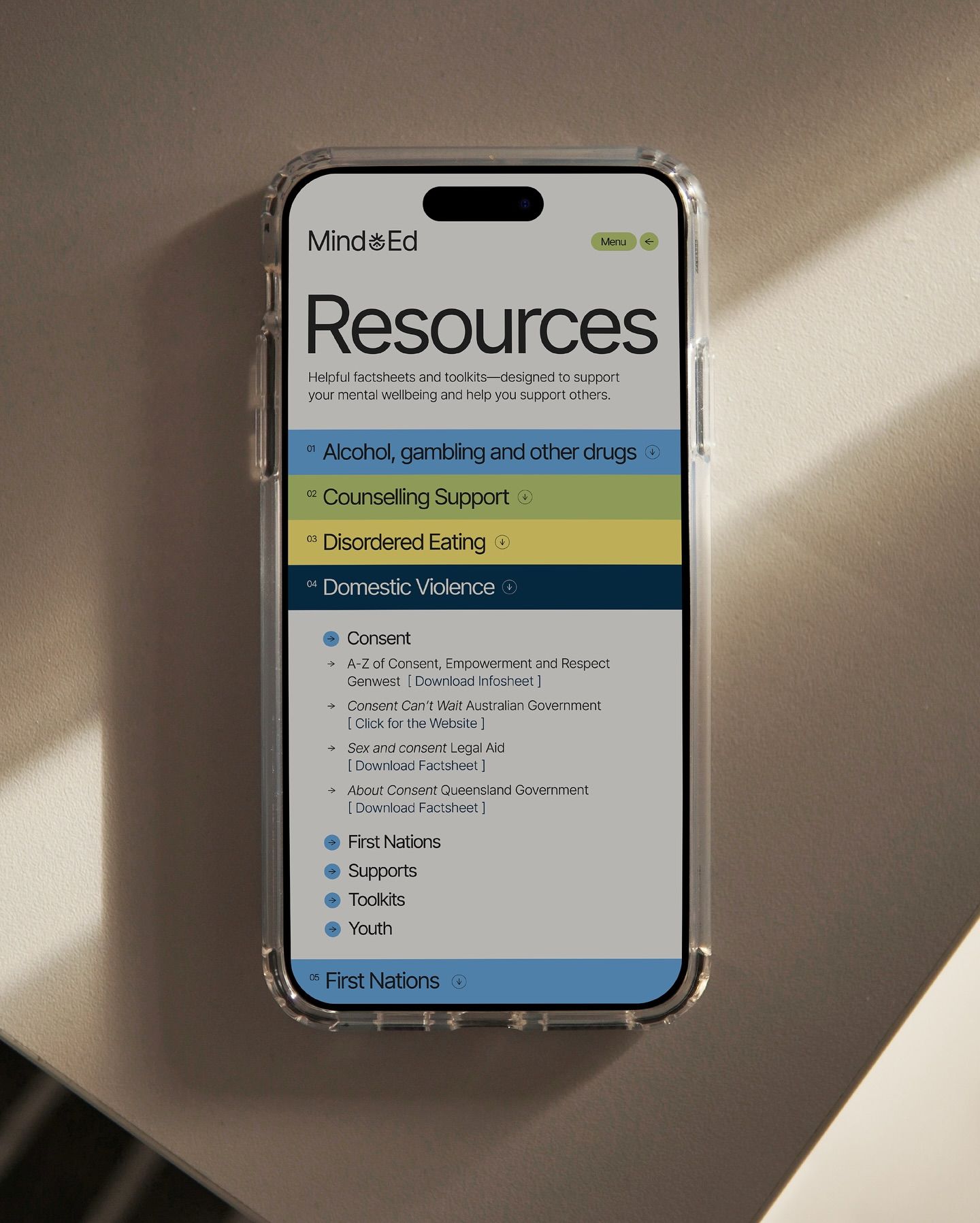 This interface demonstrates a highly functional and clean design, prioritizing accessibility and clear information hierarchy. The visual language is minimalist and professional, using ample whitespace to ensure the list of resources is easily digestible and navigable for users seeking mental health support.