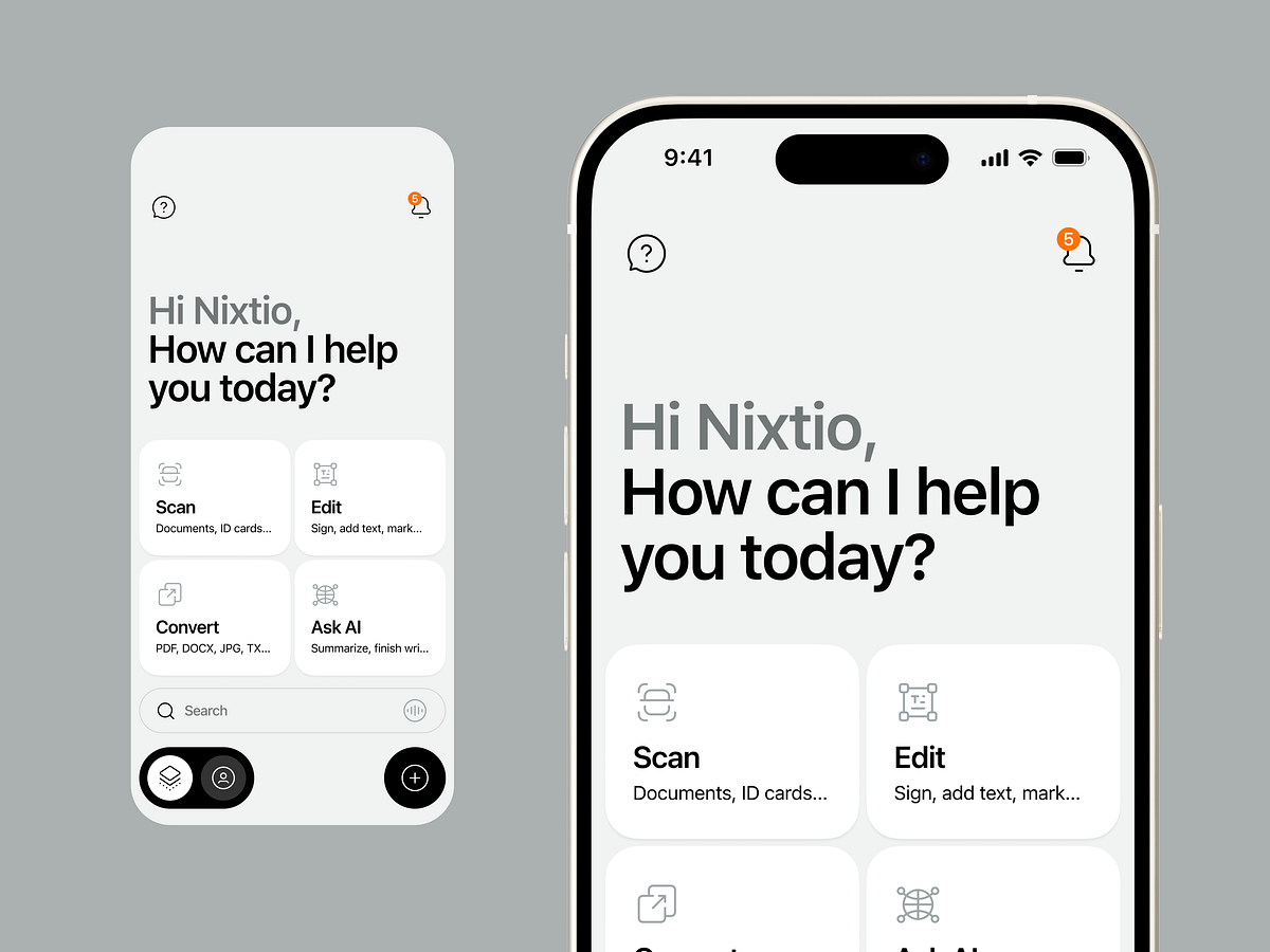A clean, minimalist mobile app interface for Nixtio, a digital assistant or productivity tool. The design features a friendly greeting prompt with organized action buttons and a modern, accessible layout optimized for mobile interaction.